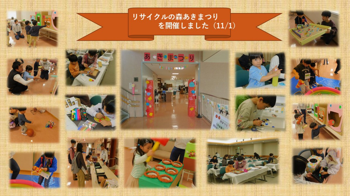 今年で3回目となるリサイクルの森あきまつりを11/1(土)に開催しました。今年も「遊んで・作って・楽しむ」をコンセプトに6つのゲームブースをス点数に応じた景品をお持ち帰りいただきました。