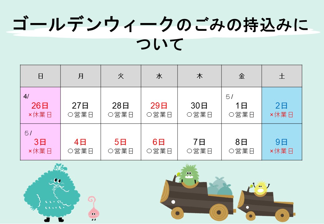 ゴールデンウィーク(2026年)のごみの受入れについてお知らせです。